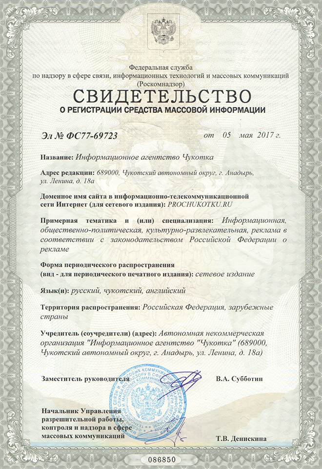 Учредитель: АНО «Информационное агентство «Чукотка» Свидетельство о регистрации СМИ ЭЛ № ФС 77 - 69723, выдано Федеральной службой по надзору в сфере связи, информационных технологий и массовых коммуникаций (Роскомнадзор) 5 мая 2017 г.