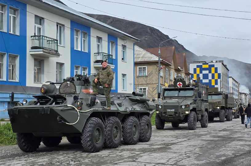 «Разгрузка боевой техники и вооружения для показа местным жителям была выполнена заблаговременно из большого десантного корабля на берег по-боевому — способом "на упор". После разгрузки экипажи боевых машин своим ходом совершили марш на центральную площадь посёлка, где была развёрнута экспозиция. В ходе встречи командиру отряда кораблей контр-адмиралу Александру Шварцу местные жители вручили традиционный хлеб и соль», — сообщили в пресс-службе Тихоокеанского флота. Источник: https://prochukotku.ru/news/bezopasnost/otryad_korabley_tikhookeanskogo_flota_vzyal_kurs_s_chukotki_na_kurily/