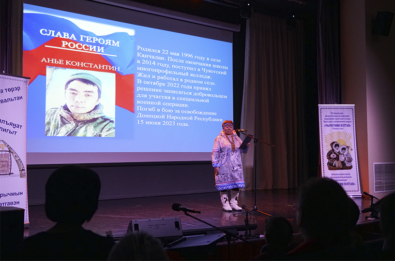 В ходе церемонии прозвучали и стихи из третьего выпуска сборника "В сердце Севера". Его презентация состоялась в пятницу в посёлке Угольные Копи. В книгу вошли стихи о северянах — участниках специальной военной операции. Среди авторов не только ветераны-фронтовики, но и их близкие, а также те, кто потерял родных в ходе боевых действий. На чукотский язык стихи перевела хранительница традиций Татьяна Асадова. Источник: https://prochukotku.ru/news/kultura/okruzhnoy_festival_rodnykh_yazykov_posvyatili_chukotskomu/