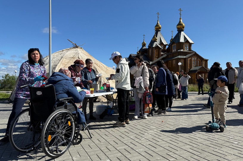Все желающие могли сдать нормативы Всероссийского физкультурно-оздоровительного комплекса "Готов к труду и обороне" в спортивной зоне. Также на площади были организованы соревнования по национальным видам спорта. Рядом с установленной хранительницей традиций Ниной Пенелькут ярангой можно было попробовать отварную оленину и национальные лепёшки кав-кав. Неподалёку организовали детскую зону с развлекательными и обучающими играми, аквагримом и другими активностями. Источник: https://prochukotku.ru/news/obshchestvo/den_korennykh_narodov_mira_otmetili_v_anadyre/
