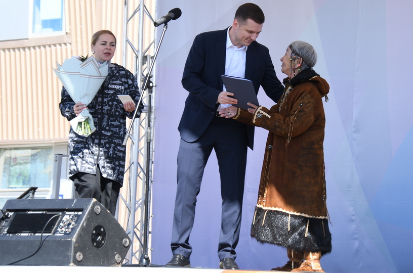 На сцене Павел Каргаполов вручил удостоверение Почётного гражданина Чукотского АО хранителю традиций и ветерану труда Антонине Кергитваль. 80-летнюю активистку общественной организации "Чычеткин вэтгав" ("Родное слово") поблагодарили за сохранение языка и традиций предков, и работу с подрастающим поколением. Источник: https://prochukotku.ru/news/obshchestvo/den_korennykh_narodov_mira_otmetili_v_anadyre/