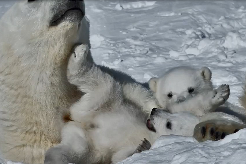 «Мать уже вывела своих медвежат, когда мы её нашли, находилась внизу по склону, во временной берлоге и, видимо, готовилась к переходу на море. Мы как раз застали несколько дней, когда она, собственно, выгуливала детёнышей: они лежали на маме, грелись на солнышке. В результате мы сняли с близкого расстояния очень интересные кадры из жизни белых медведей. Вообще первые два дня была пурга, но после этого нас ждала великолепная погода, солнечная и спокойная, которая совершенно неожиданно для острова Врангеля держалась все 10 дней нашей там работы. В первый день мы нашли две берлоги, примерно на расстоянии 150 метров друг от друга, выше и ниже по склону. И в какой-то момент нам даже удалось снять, как я считаю, очень редкие кадры, когда две семьи медведей гуляли вместе на одном склоне. У одной семьи был один медвежонок, у другой семьи – два», – рассказал режиссёр Леонид Круглов. Источник: https://prochukotku.ru/news/priroda/druzhelyubnaya_medveditsa_s_medvezhatami_stala_zvezdoy_syemok_na_ostrove_vrangelya/