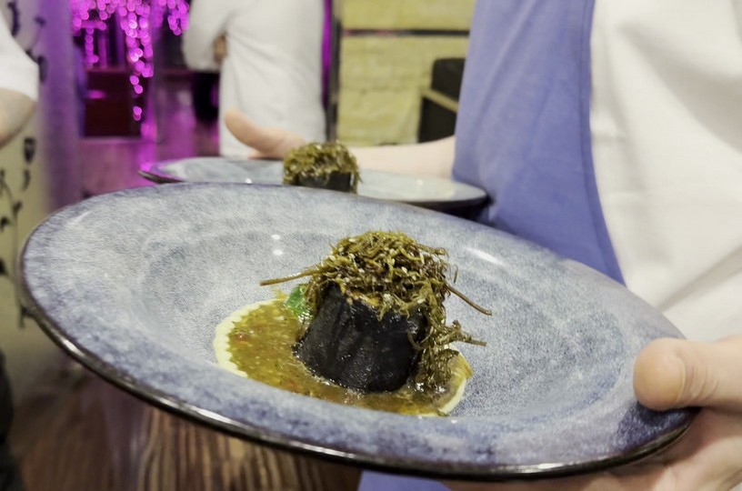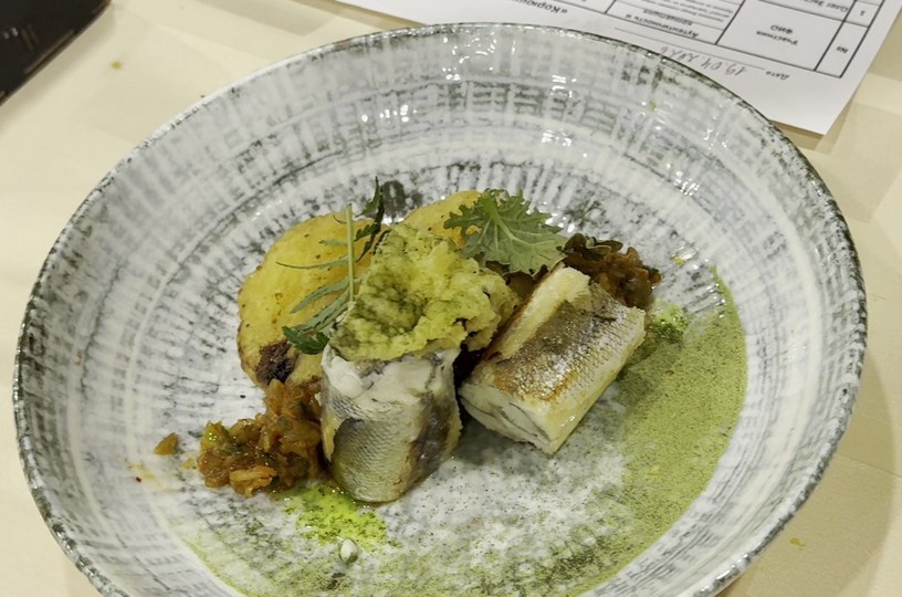 «Вообще я планировал приготовить другое блюдо, но на круглом столе мы с местными жителями обсуждали проблему, как можно соединять те или иные продукты. В итоге мне пришлось выполнить обещание и сделать блюдо по их желанию, но с применением наших хабаровских эндемиков. Привёз всё сезонное – вымоченную в соке лимонника корюшку, грибы, морской виноград и добавил немного азиатских нот, потому что Хабаровск граничит с Китаем и у нас идёт большое переплетение кухонь. Всё завёрнуто в рулет и выполнено в технике су-вид. Плюс гарнир из черемши с соусом», – сообщил Роман Горячев.