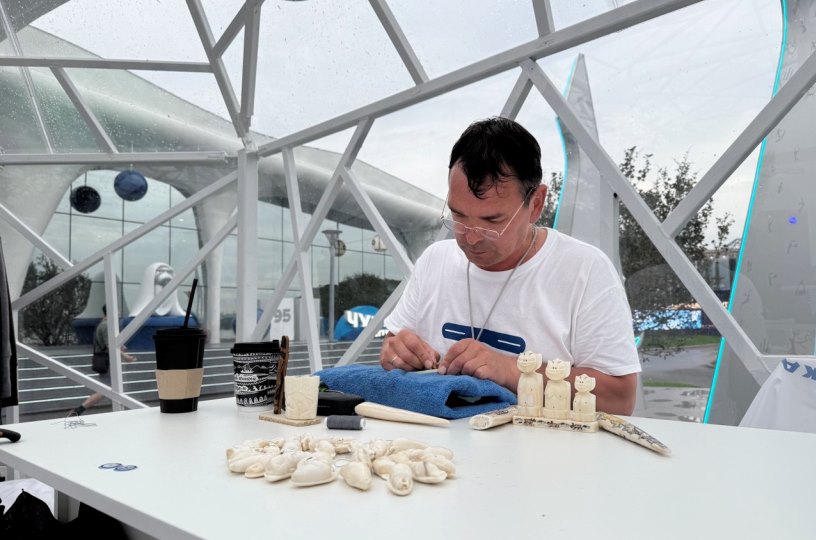 Рядом с павильоном можно попробовать кофе по-чукотски и чай с тундровыми травами. На концертной площадке выступают артисты ансамбля "Эргырон", студии "Полюс притяжения" и другие исполнители. Рядом проводят мастер-классы представители Уэленской косторезной мастерской. Также представлены сувениры, изготовленные мастерами округа, одежда с символикой Чукотки и другая продукция. Источник: https://prochukotku.ru/news/vef/ot_ministra_do_turistov_pavilon_chukotki_na_vef_otkrylsya_dlya_vsekh_zhelayushchikh/
