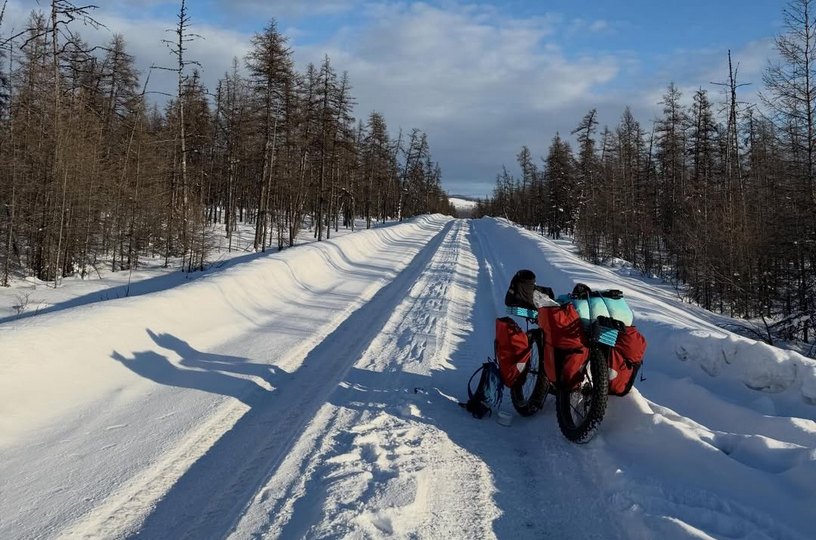 Дорога от Черского до Певека заняла у путешественника две недели. Расстояние почти в 700 километров он преодолел на фэтбайке – велосипеде с широкими колёсами и шинами с пониженным давлением. Всё необходимое Хуан Менендес везёт в велосумках. С собой у него палатка, спальник, горелка и запас продуктов. Источник: https://prochukotku.ru/news/turizm/ispanskiy_veloputeshestvennik_dobralsya_do_samogo_severnogo_goroda_rossii/